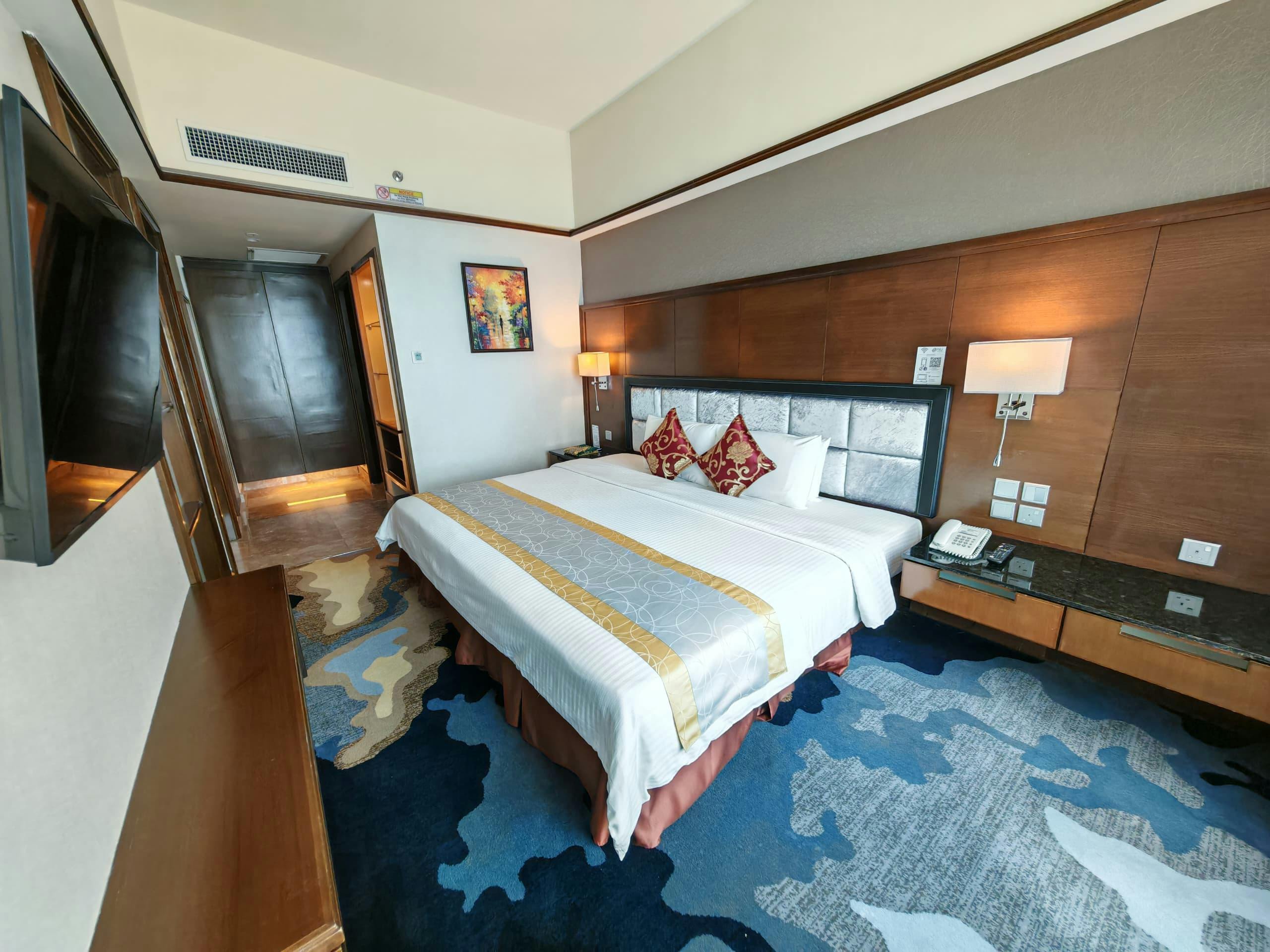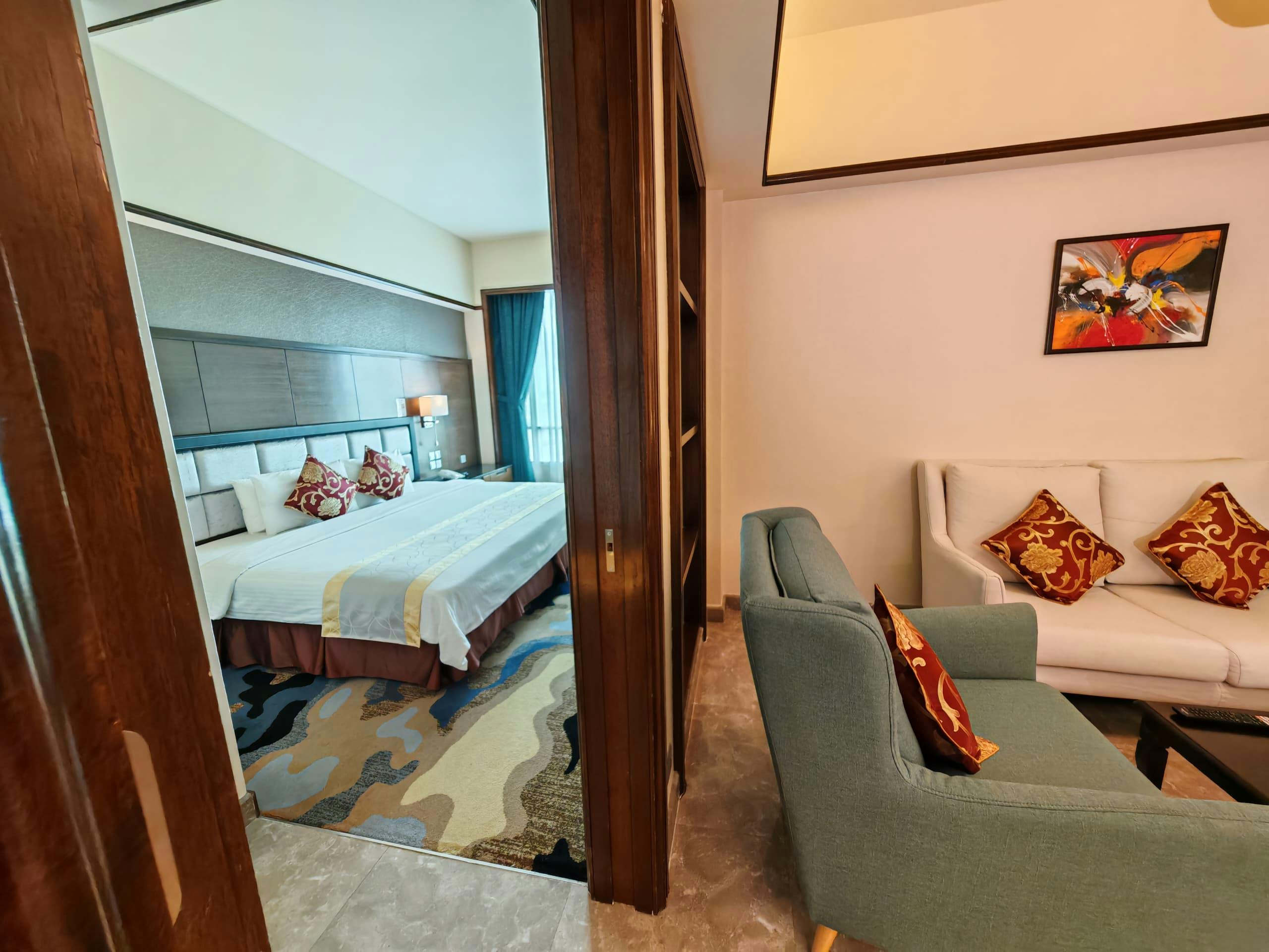 Discover a haven of comfort and elegance in our Premier Suite, meticulously designed to provide an exceptional stay. This luxurious suite features a spacious bedroom alongside a separate living area, offering ample space for relaxation and entertainment. The contemporary-modern decor seamlessly blends subtle shades of beige, brown, and cream, creating a warm and inviting atmosphere that exudes sophistication and tranquility. Thoughtfully furnished with plush furnishings and stylish accents, the Premier Suite delivers a home-like ambiance, perfect for unwinding after a day of exploration or business. Whether you're seeking a peaceful retreat or a stylish space to entertain, our Premier Suite promises a memorable experience filled with comfort and refined elegance.